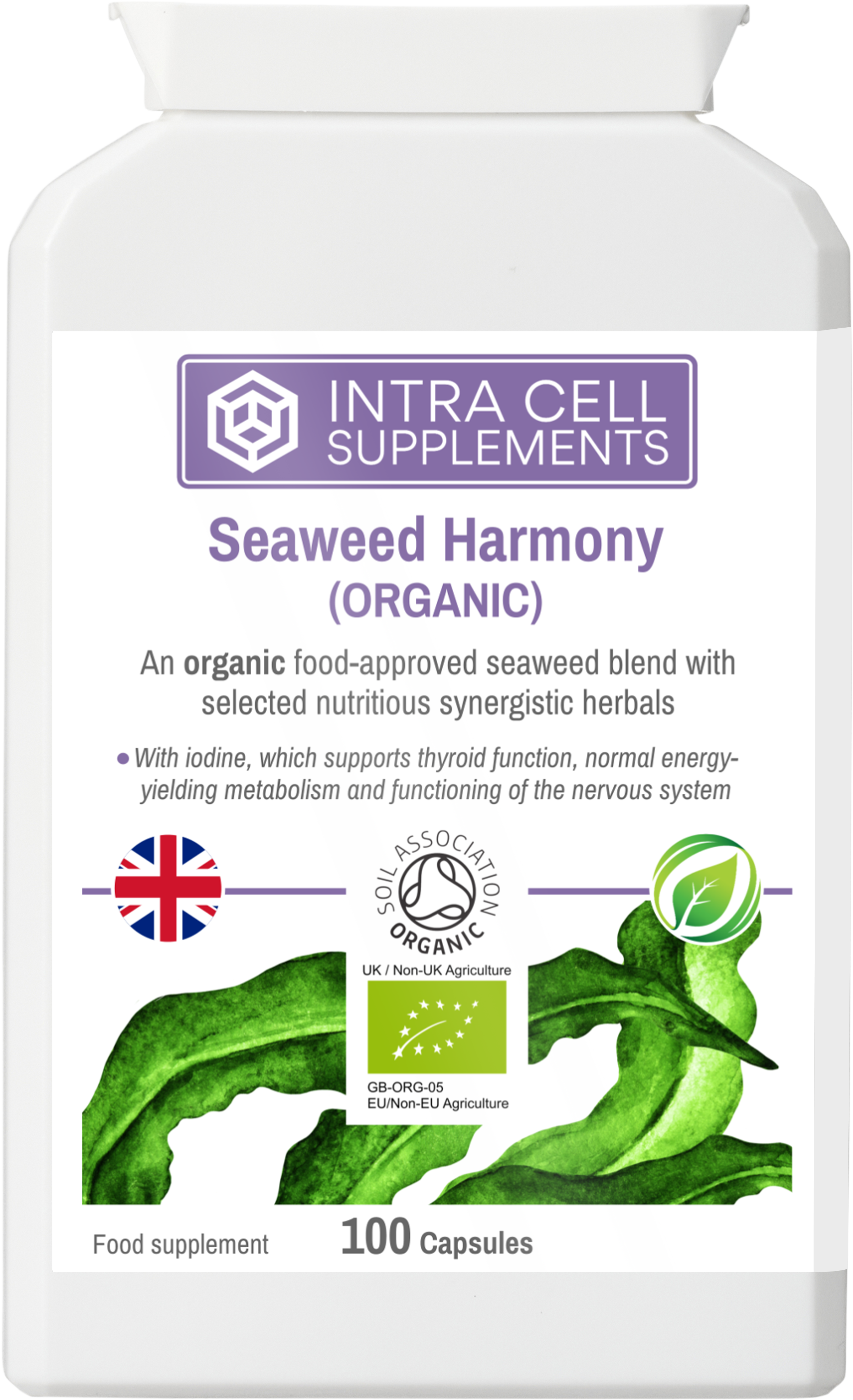 This organic food supplement offers a unique blend of iodine-rich, food-approved seaweeds (Ascophyllum nodosum and Fucus vesiculosus), with a range of vegetables and herbs: artichoke, chlorella, green tea leaf, spirulina, ashwagandha (Withania somnifera) root and cayenne.
